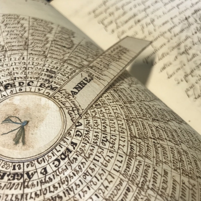Ce manuscrit exceptionnel témoigne de l’enseignement de la navigation au Havre, dispensé dès 1666 par l’école royale d’hydrographie. Rédigé par Jean-Baptiste Le Grip, il rassemble plus de 350 pages illustrées : 140 dessins et diagrammes, dont 7 planches dépliantes, une vue de navire de guerre, et 6 volvelles — disques mobiles en papier permettant de calculer les marées. Un document rare et fascinant sur les savoirs maritimes d’autrefois.