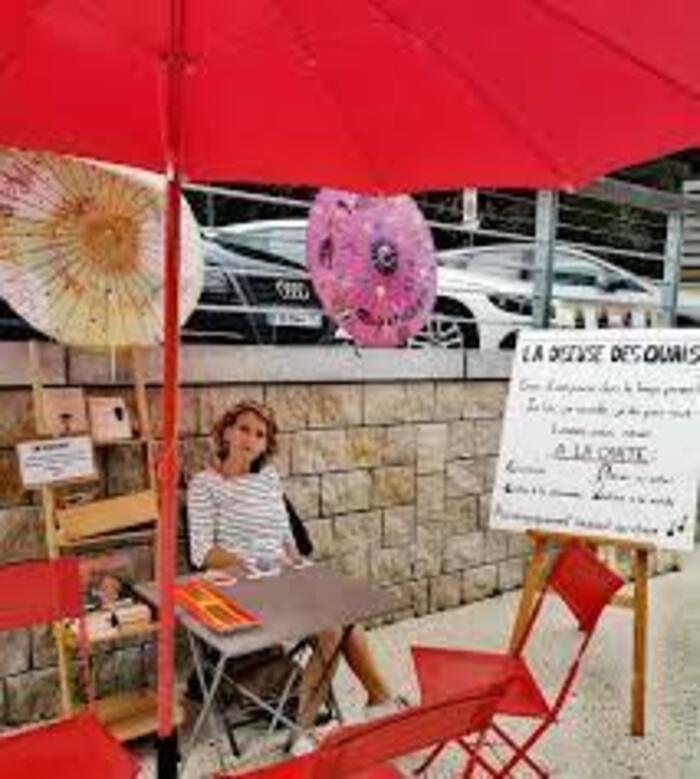 Avec sa Diseuse, Karine Mazel s’installe là, au coin de la rue. Vous vous asseyez. Elle tire une carte, écoute, et vous dit — ou vous chante — quelque chose pour vous, là, maintenant.Une pause inattendue dans la journée. Un moment pour tomber juste, sans rendez-vous.