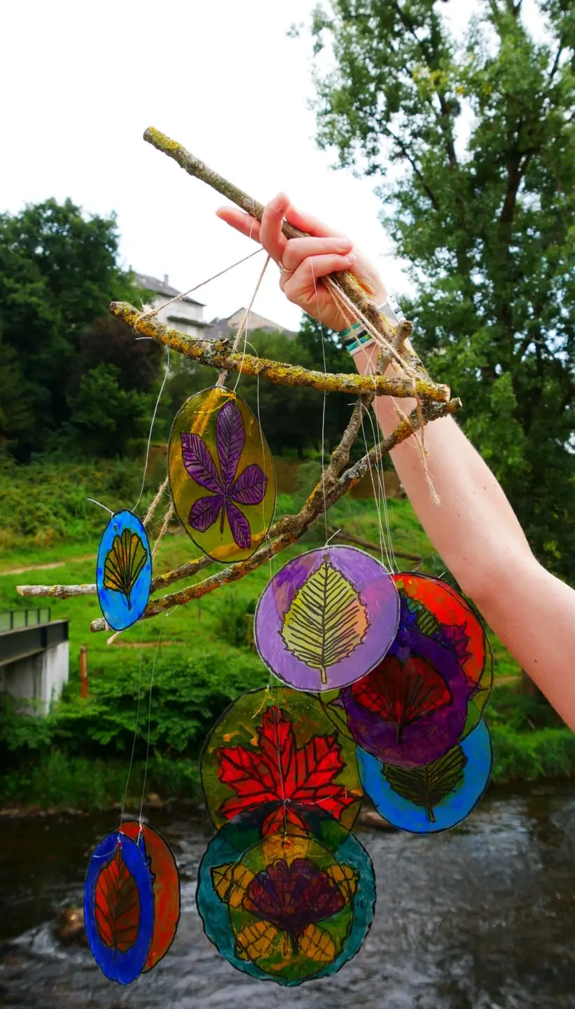 Création d’un mobile à suspendre avec la technique du vitrail. Pour ne pas se couper, on utilise une matière plastique souple et facile à découper, sur laquelle on choisit des motifs et des couleurs peintes avec de la peinture vitrail.