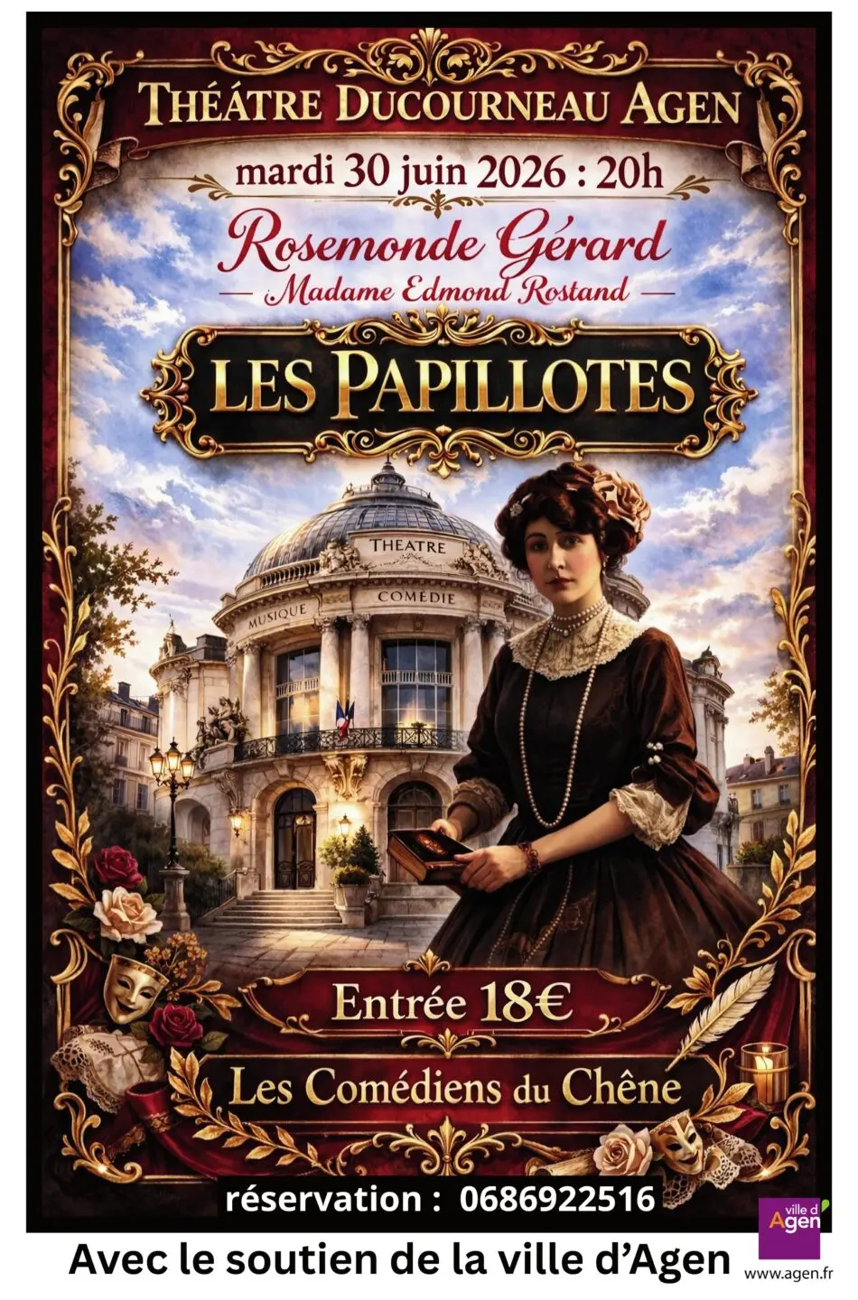 La troupe des Comédiens du Chêne présente au Théâtre d’Agen Les Papillotes, pièce oubliée de Rosemonde Gérard, dédiée à Agen et au poète Jasmin. Une redécouverte inédite à l’occasion des 160 ans de sa naissance.