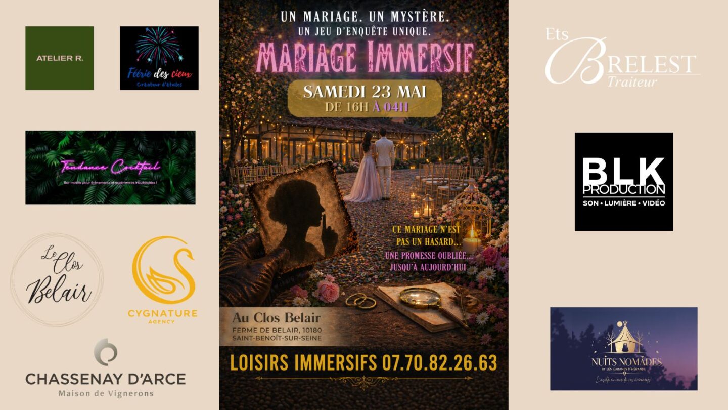 Bienvenue au Mariage Immersif, une expérience unique où vous n’êtes plus simple invité, mais véritable acteur d’une soirée pleine de surprises, d’émotions et de mystère.