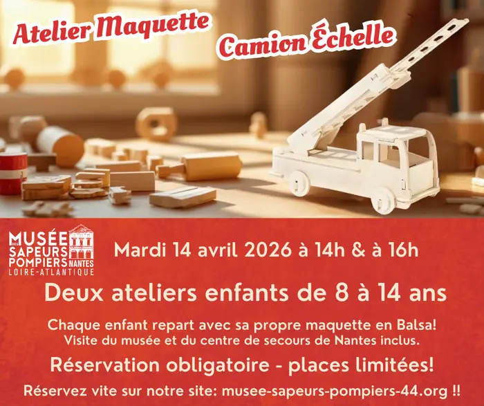 Gratuit : non 7 € enfant / 3 € adulte accompagnant. • 7 € par enfant incluant la maquette.• 3 € pour l’adulte accompagnateur.• Chaque enfant doit être accompagné par un membre de sa famille.• Les enfants repartiront avec leur maquette en bois, prête à peindre.?? Places limitées – participation uniquement sur réservation :atelier de 14h : https://www.helloasso.com/associations/association-des-amis-du-musee-des-sapeurs-pompiers-de-loire-atlantique/evenements/viens-realiser-ta-maquette-en-bois-14h-16h atelier de 16h : https://www.helloasso.com/associations/association-des-amis-du-musee-des-sapeurs-pompiers-de-loire-atlantique/evenements/viens-realiser-ta-maquette-en-bois-16h-18h-2 Jeune Public – Age minimum : 8 et Age maximum : 14