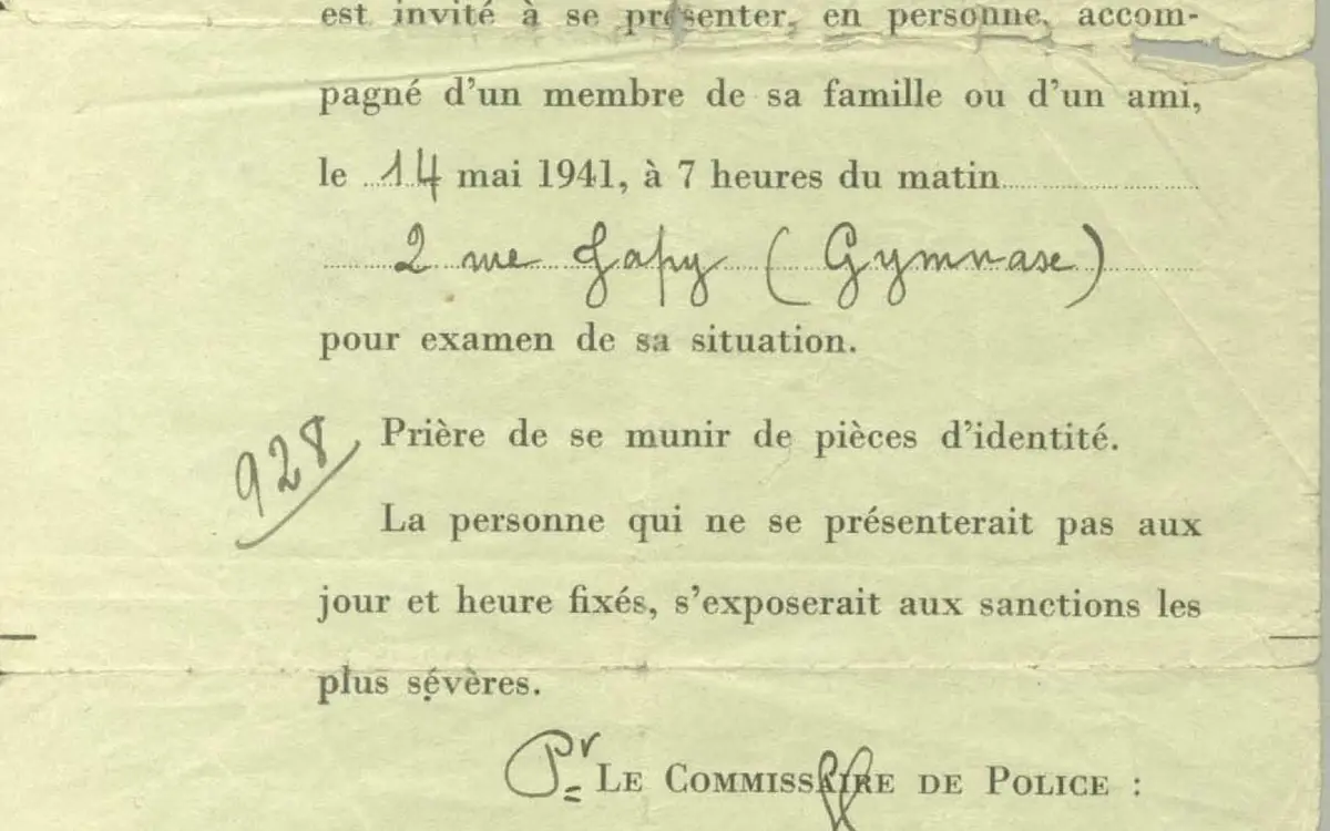 Le 14 mai 1941, 3 700 hommes juifs étrangers sont arrêtés après avoir reçu une convocation officielle – le « billet vert » – les invitant à se présenter pour un prétendu « examen de situation ». Plusieurs centres parisiens, dont le gymnase Japy dans le 11e arrondissement, sont réquisitionnés pour contrôler les papiers. Ces hommes tombent dans un piège tendu par les autorités nazies et françaises. Arrêtés, ils sont ensuite transférés vers les camps d’internement de Pithiviers et de Beaune-la-Rolande.