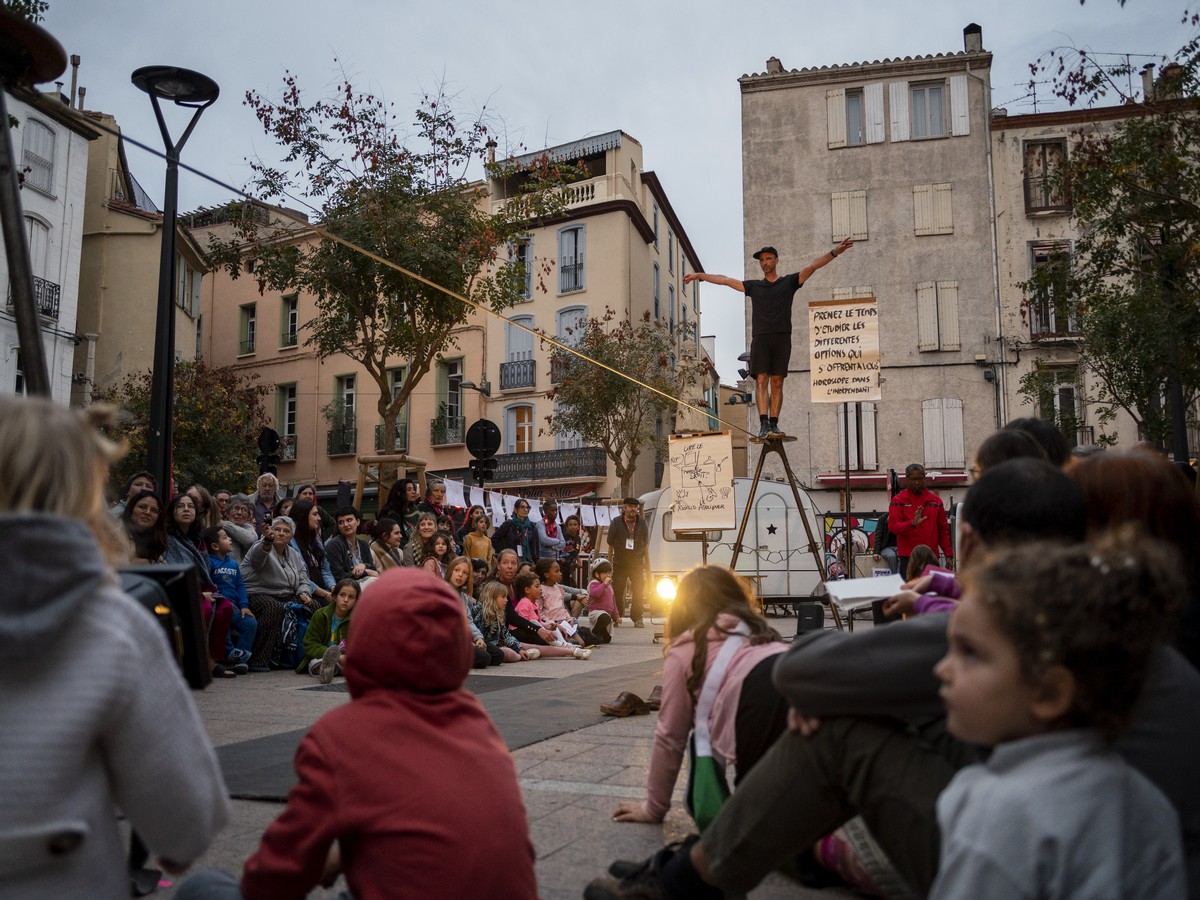 Sébastien Le Guen, tightrope walker and draughtsman, takes up residence in town. With his wire strung between two trees, he never goes unnoticed. For two days, in front of curious onlookers, the man trains for several hours, then spends the rest of his time sketching what happens around him and what people say to him. From these encounters, Sébastien draws several portraits, which he gradually hangs around his caravan. And soon, as in an exhibition, his sketches invade the public space.