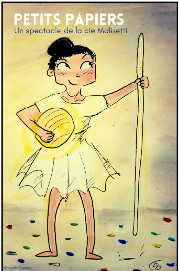 Sur sa route, elle rencontre des papiers, différents de ceux qu’elle connaît. Papier crépon ou papier de soie, papier journal ou papier cartonné, chaque feuille devient alors matière à jouer, à explorer. Des premiers essais à des idées de plus en plus farfelues, le personnage entre dans le jeu et la danse. Papiers lancés, froissés mais aussi caressés ou portés, entraînent le personnage vers de petits pas de danse à la poésie délicate et joyeuse.