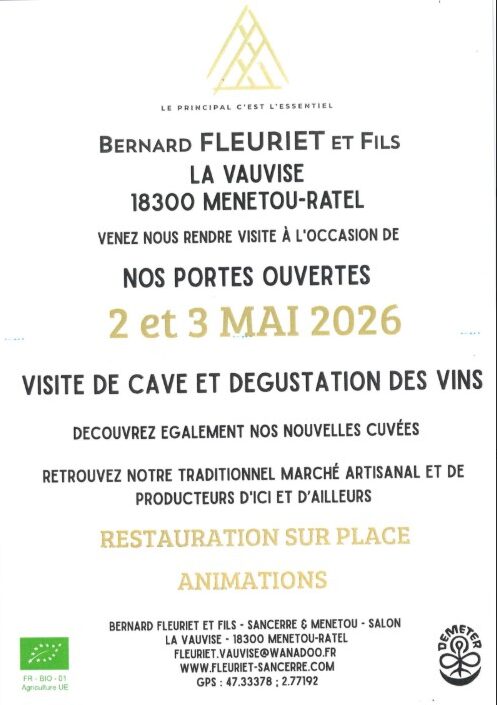 Portes ouvertes domaine Bernard Fleuriet Menetou-Râtel samedi 2 mai 2026.