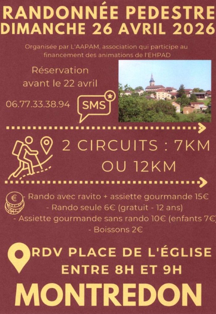 L’association AAPAM propose une randonnée pédestre conviviale au départ de Montredon. Cette matinée sportive et solidaire invite les marcheurs à découvrir les paysages environnants grâce à deux circuits accessibles de 7 km ou 12 km. L’événement, organisé au profit des animations de l’EHPAD, se déroule dans une ambiance chaleureuse avec ravitaillement et possibilité de prolonger le moment autour d’une assiette gourmande. Une belle occasion de mêler activité de plein air, solidarité et convivialité.