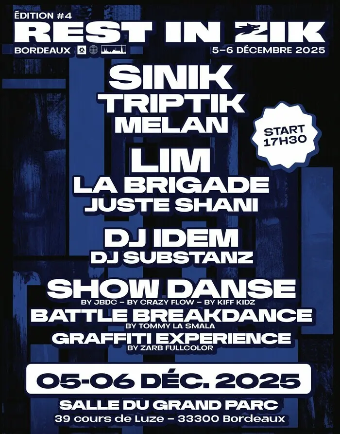 Le festival REST IN ZIK présente sa 4e édition à la Salle des Fêtes Bordeaux Grand Parc avec LIM, JUSTE SHANI, LA BRIGADE, MELAN, TRIPTIK, SINIK… concert rap