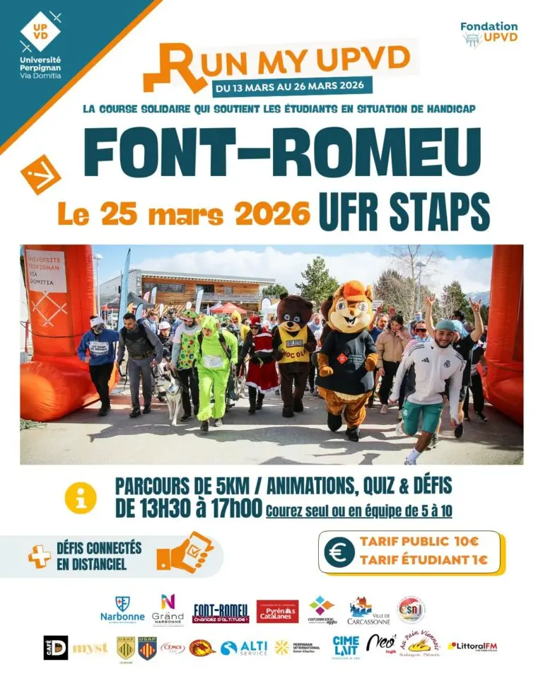 La RUN MY UPVD 2026 est une course solidaire organisée par la Fondation UPVD pour soutenir les étudiants en situation de handicap. L’événement se déroule du 13 au 26 mars 2026 dans plusieurs villes et a pour objectif de promouvoir l’inclusion tout en récoltant des fonds pour aider les étudiants à poursuivre leurs études dans de bonnes conditions.