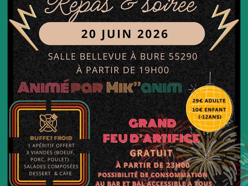 Soirée et repas année 80 et grand feu d’artifice Bure samedi 20 juin 2026.