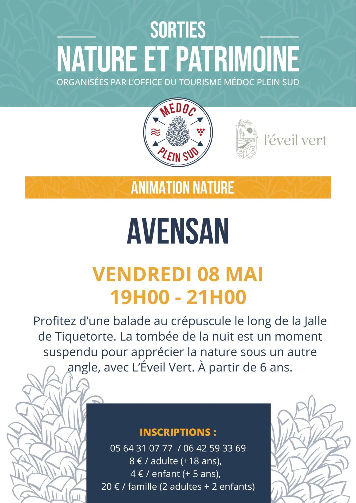 Balade au crépuscule Profitez d’une balade au crépuscule le long de la Jalle de Tiquetorte. La tombée de la nuit est un moment suspendu pour apprécier la nature sous un autre angle, avec L’Éveil Vert. À partir de 6 ans. .