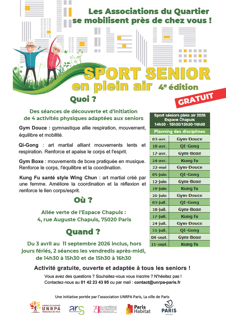 Sport seniors en plein air : Gym douce, Qi Gong, Gym Boxe et Kung Fu à UNRPA Paris UNRPA Fédération de Paris Paris vendredi 3 avril 2026.
