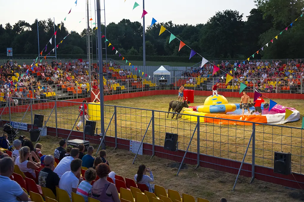 L’arène en folie ! 1h30 de fou rire avec les vachettes et les meilleurs jeux d’Intervilles autour d’une piscine géante. Tout le monde peut participer et descendre dans l’arène, mais attention certaines vachettes aiment aussi se baigner… Également une animation réservée aux enfants et un jeu uniquement réservé aux dames.