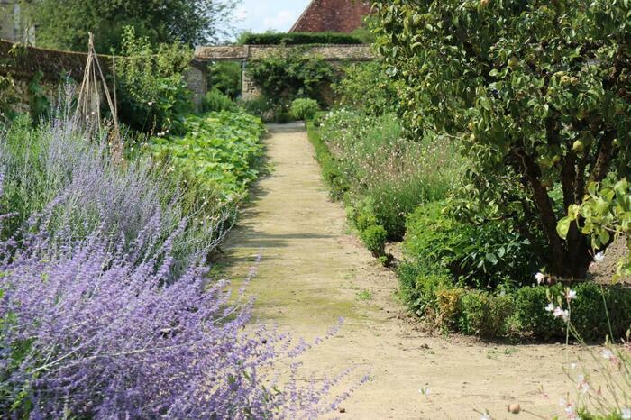 Potager de 4000 m2 cultivé sans discontinuité depuis sa création en 1850. Les dix parcelles bordées de buis, de poiriers et de pommiers taillés offrent un merveilleux spectacle visuel.