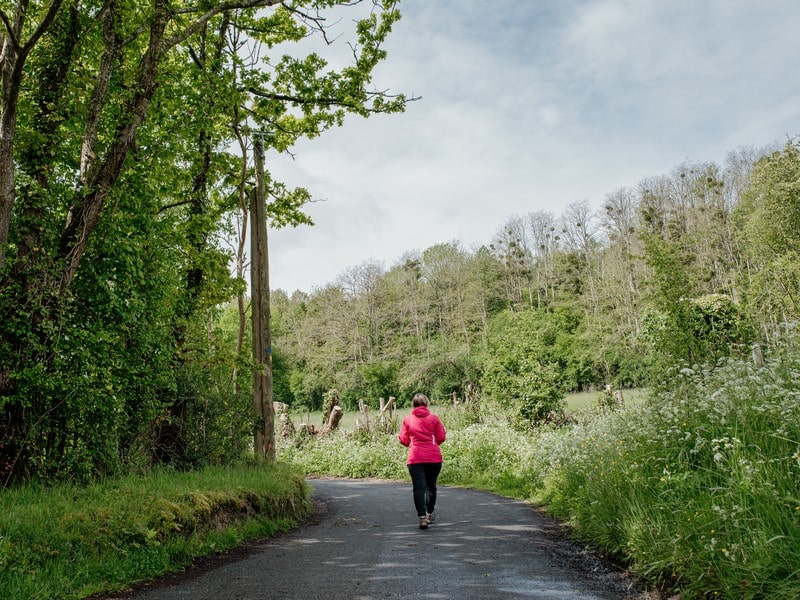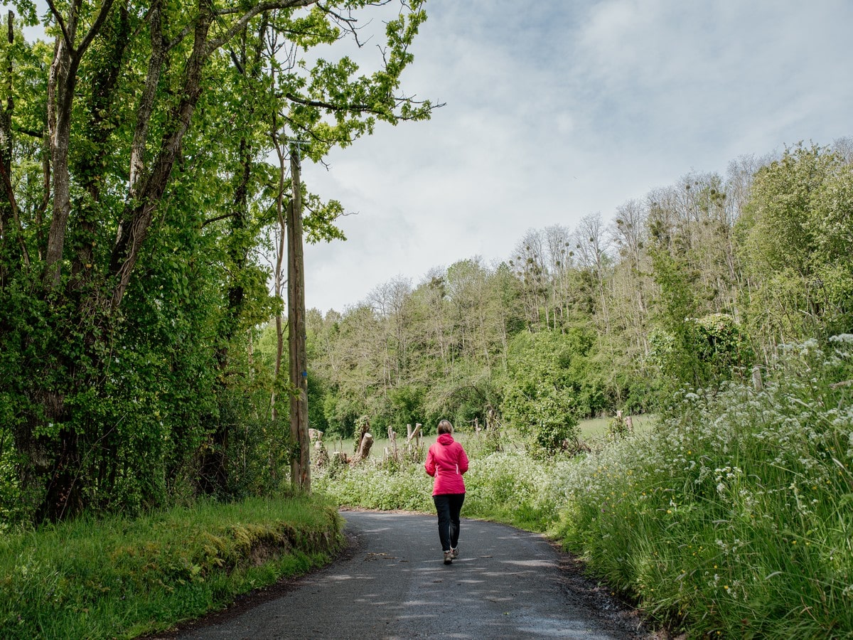 Observez le panorama, le bourg d'Ouilly-le-Vicomte et les frondaisons du parc du Château de Boutemont de l'autre côté du chemin de fer, depuis le chemin entre la Fontaine Verbois et la Bruyère aux Rouliers, au-dessus du Lieu Chéri.