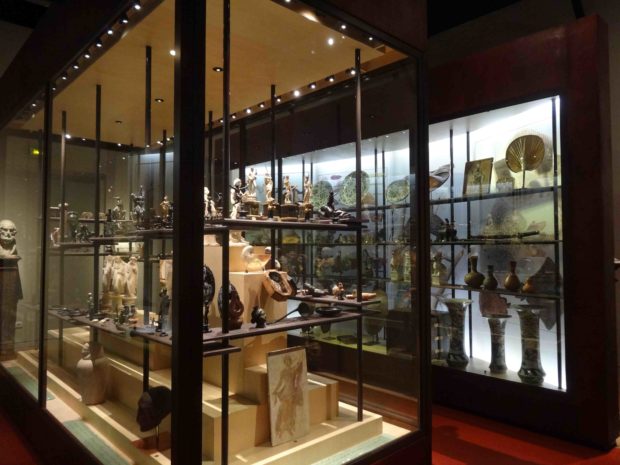 Évoluant au fil des acquisitions, ces cabinets de curiosités étaient à l’époque souvent composés par association d’idées. Ils se visitaient souvent à plusieurs tandis que le collectionneur narrait ses découvertes et l’expérience de cultures plus ou moins lointaines. Une dimension pédagogique s’attachait ainsi à ces lieux. Comme beaucoup d’amateurs d’art, Robien s’intéressait à l’archéologie et sa collection regroupe des pièces d’Occident, de Grèce, de Rome, de pays asiatiques, d’Amérique et d’Afrique. Ce mélange entre trouvailles archéologiques et contemporaines offre un voyage au cœur des civilisations du monde entier. 345 éléments ont été rassemblés dans ces meubles, mais beaucoup ont disparu en raison d’un manque de soins et de savoir-faire nécessaire à un bon conditionnement et une conservation pérenne.