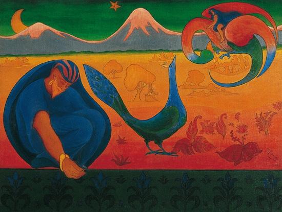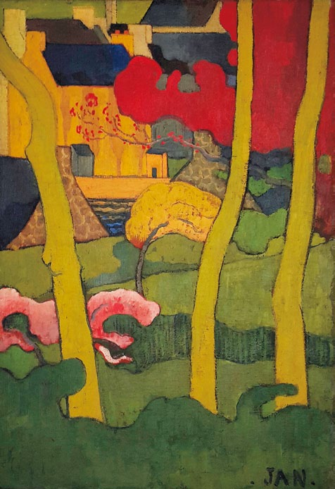 « Comment voyez-vous ces arbres ? Ils sont jaunes. Eh bien, mettez du jaune ». Avec cette même couleur, le Paysage décoratif (vers 1891-1892) de Jade Verkade prend des allures d’estampes japonaises et porte à son paroxysme les principes de Gauguin à Sérusier. « […] cette ombre, plutôt bleue, peignez-la avec de l’outremer pur ». Le turquoise des ombres dans Le Talisman apporte la lumière aux Arbres rouges et fougères en automne (1905) et contraste avec les couleurs taupes et ocre de cette vue automnale d’un sous-bois.