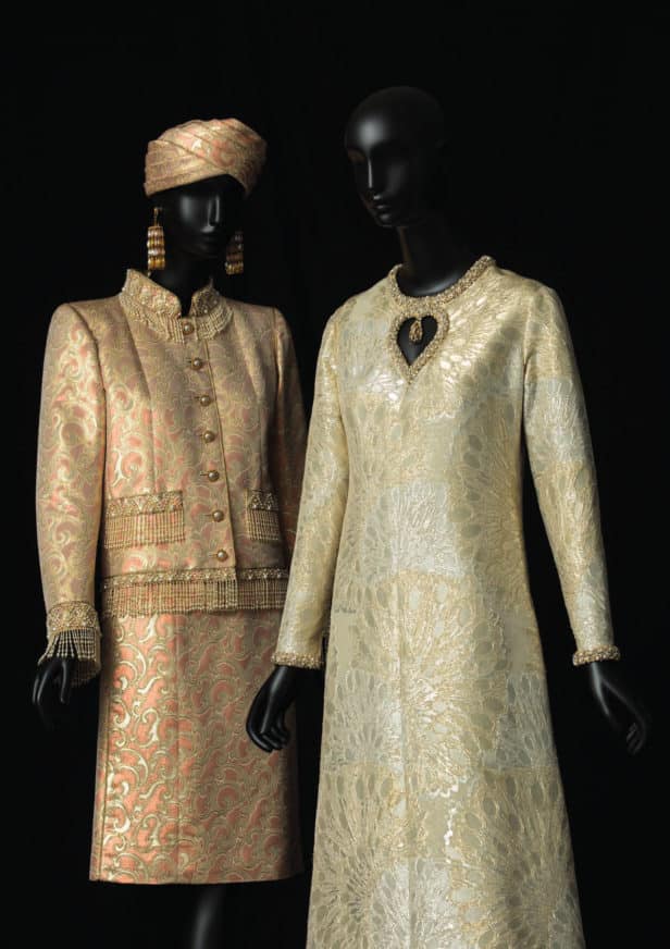 Dès la première collection de printemps-été 1962, Yves Saint-Laurent a réinterprété les somptueux manteaux des souverains d’Inde du Nord et intégré les soieries précieuses brochées d’or et les broderies métalliques en relief qu’il affectionnait tant à des créations innovantes. Des costumes de la garde impériale et du manteau traditionnel indien sont nés des vêtements féminins et modernes – à l’image du génie qu’était le couturier – comme en témoignent les créations aux tons délicatement dorés de la collection printemps-été 1982.