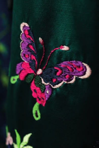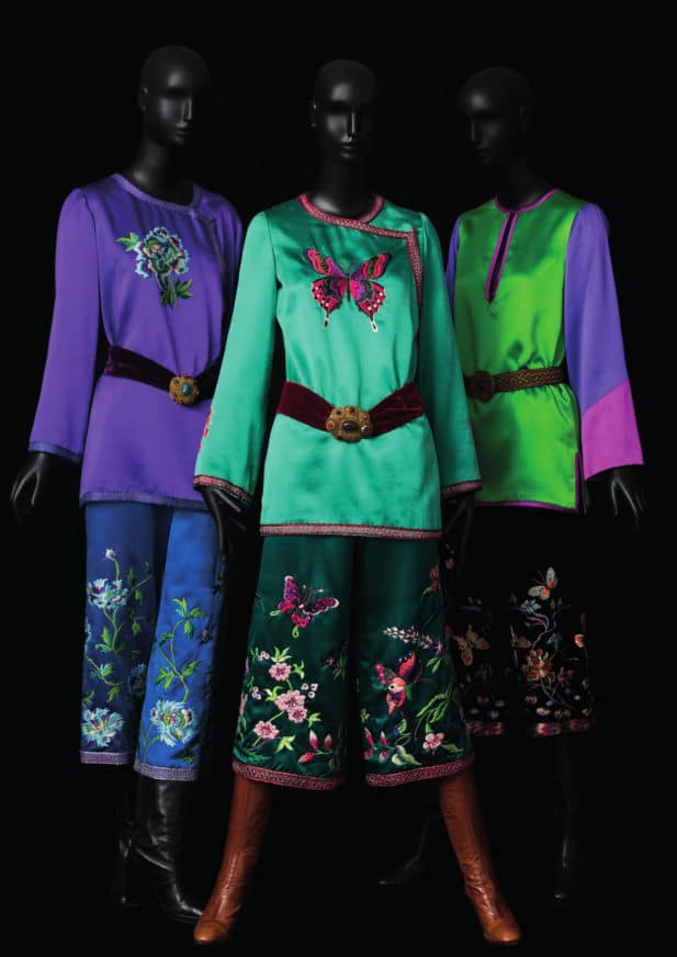 La Chine est entrée dans les créations d’Yves Saint-Laurent par le biais de vêtements amples dés la collection automne-hiver 1970. Les motifs floraux aux couleurs vives des robes bianfues (vêtements de loisirs) ont orné les tuniques fluides aux manches en T et les blouses longues dessinées par le couturier. Du vert, du violet ou du bleu… les motifs brodés d’ensembles du soir parlent de soi.
