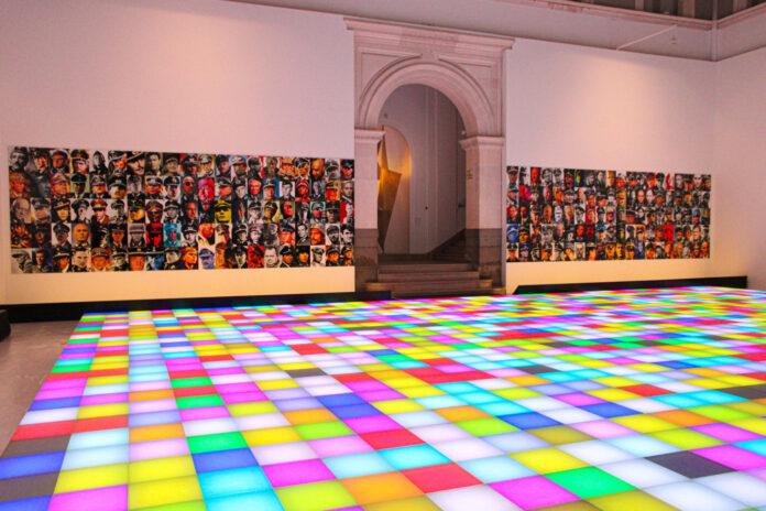 Si l’artiste polonais Piotr Uklański fait surgir la lumière du patio du musée en y installant un dancefloor, Tony Regazzoni plonge sa coursive dans un show au laser bleuté.
