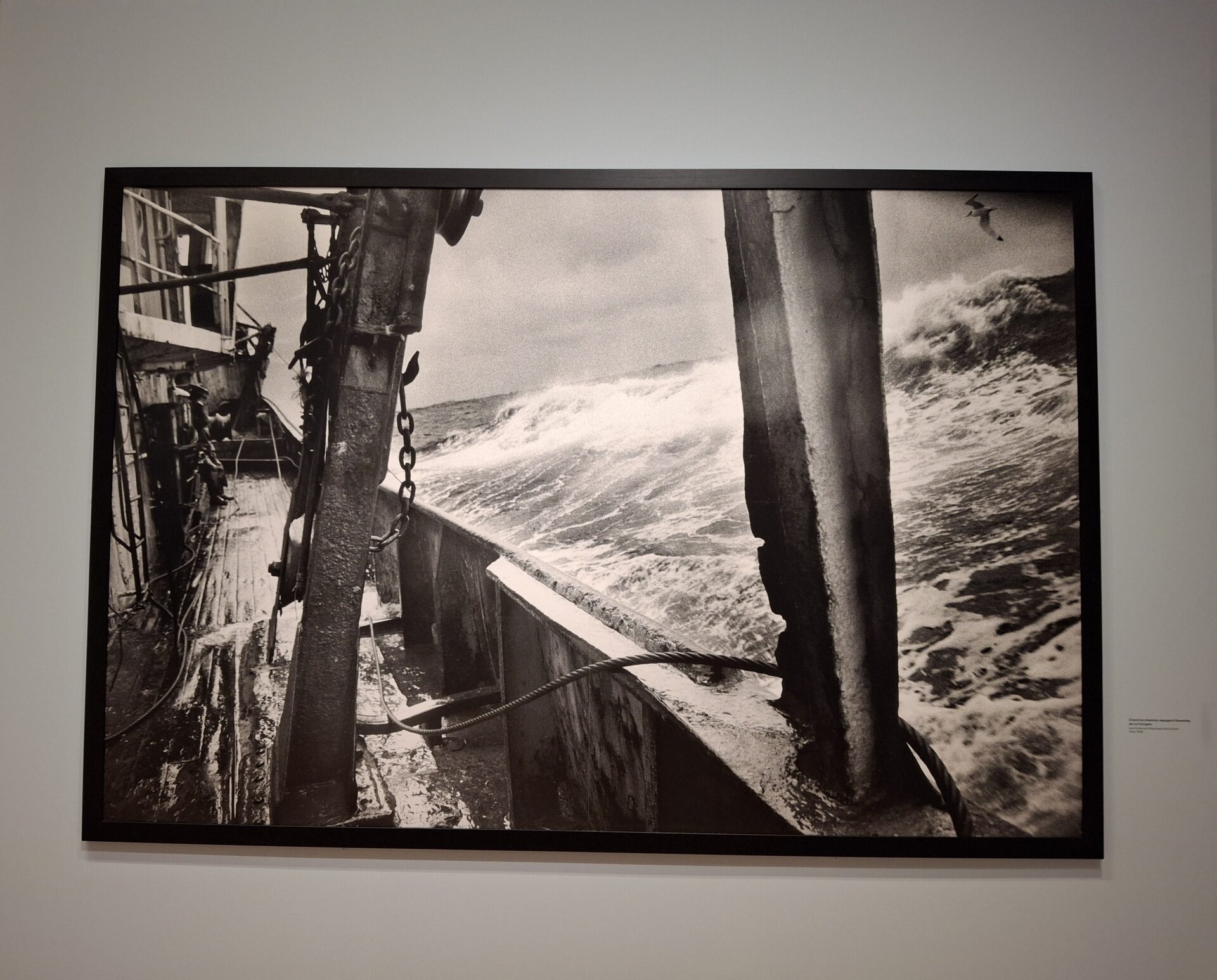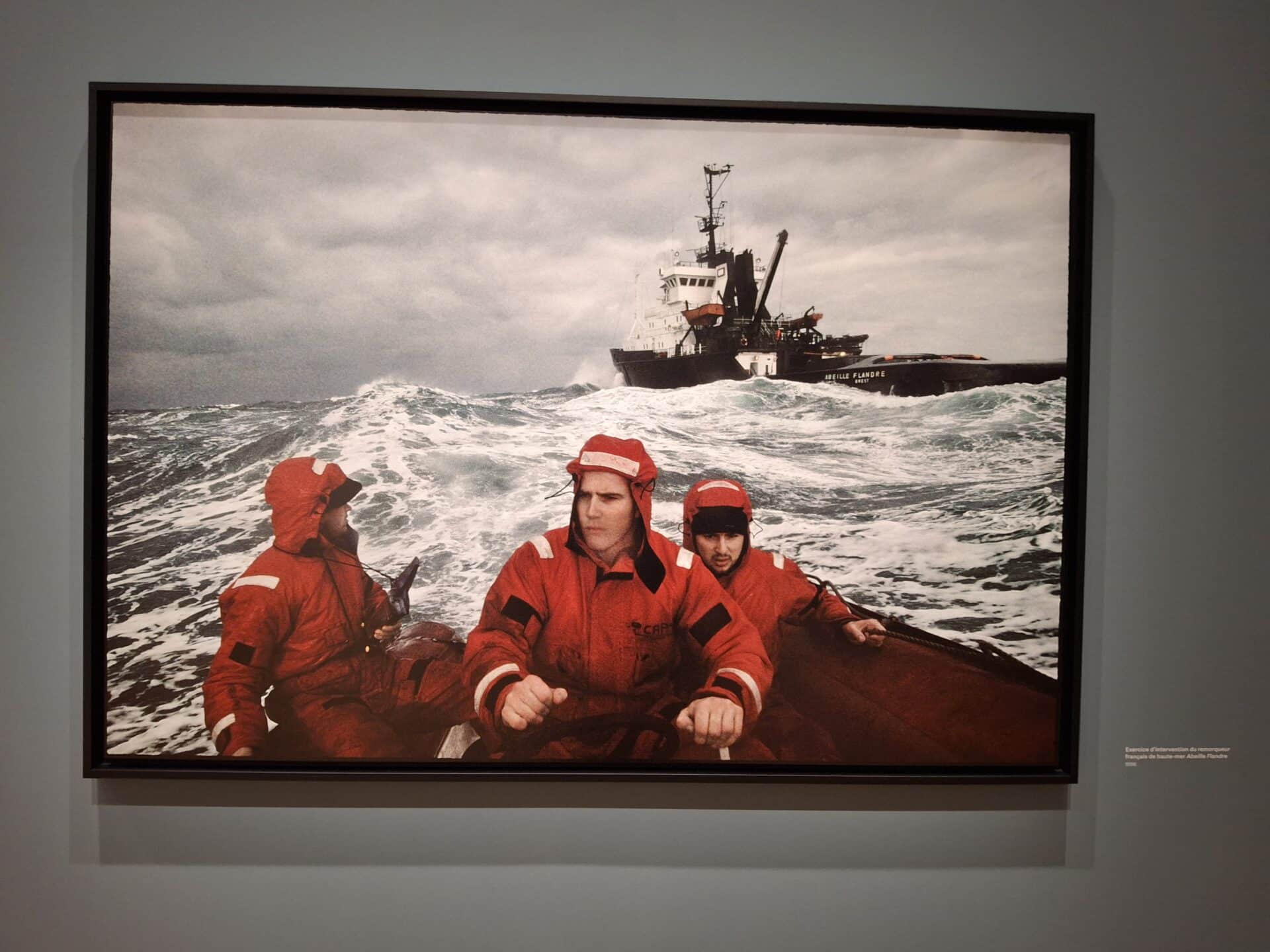 Le parcours de l’exposition dévoile une intensité rare des thématiques maritimes de ce photographe contemporain : la pêche ; la pleine mer ; les marées noires et le traumatisme qu’elle engendrent ; le huis-clos des sous-marins ; les secours en mer ; le travail des femmes ; les éoliennes en mer ; l’exploration des pôles, etc.