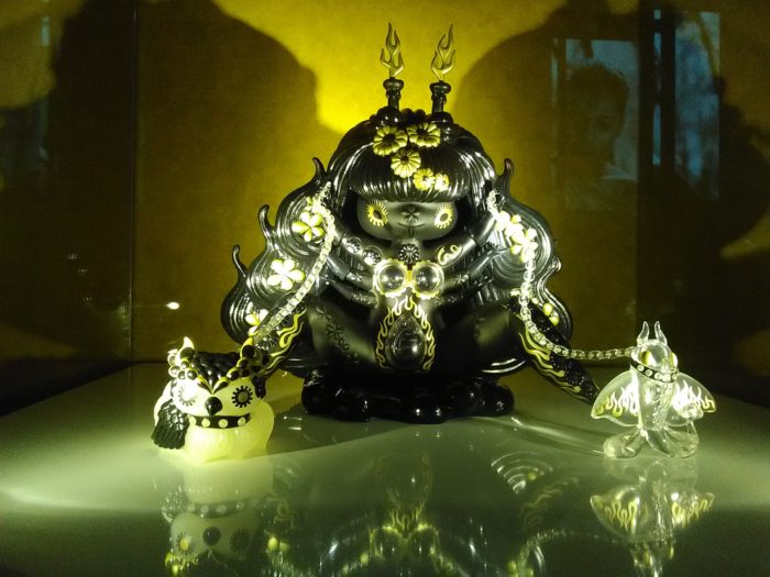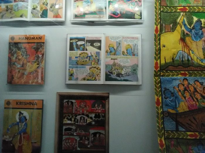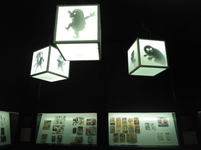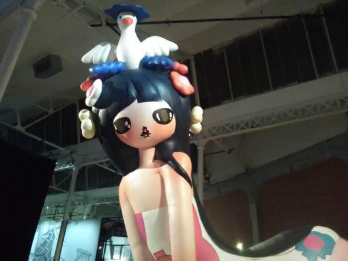 Accueilli par une poupée gonflage géante en tenue légère – œuvre de la dessinatrice Aya Takano et le plasticien Takashi Murakami – le public est plongé dans une exposition immersive aux couleurs pop où regorgent 300 planches originales, 200 volumes de bandes-dessinées et une centaine de fac-similés. Des objets exceptionnels, tels que des estampes japonaises du XIXe siècle, deux kaavads – sanctuaires portatifs utilisés par les conteurs du Rajasthan – ou la reconstitution du bureau de travail d’un des mangaka (dessinateur de manga au Japon) les plus prometteurs Fukutani Takashi sont également présents et complètent l’exposition parfois dense.
