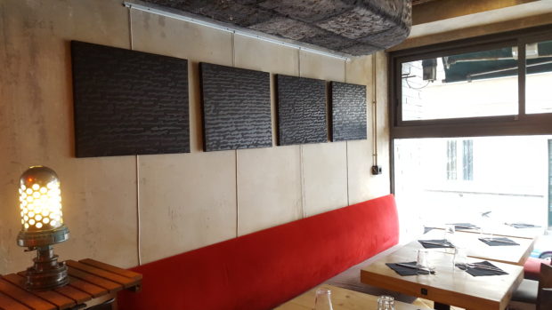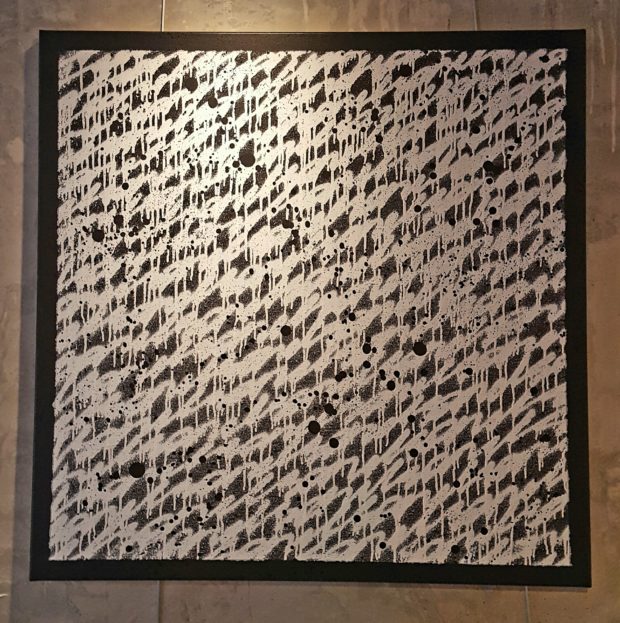 Les contraintes liées à l’espace d’accrochage n’ont en aucun cas étaient un obstacle et Tom Nelson a plutôt travaillé à adapter ses formats au lieu. Ce type d’endroit n’est d’ailleurs pas une découverte pour lui qui a débuté par des expositions dans des bars et restaurants. Sans oublier ses racines artistiques dans l’univers du graffiti, le travail du jeune artiste présente certaines évolutions. Travaillant à ses débuts sur des supports de récupération, la professionnalisation l’a amené à se tourner davantage vers la toile.