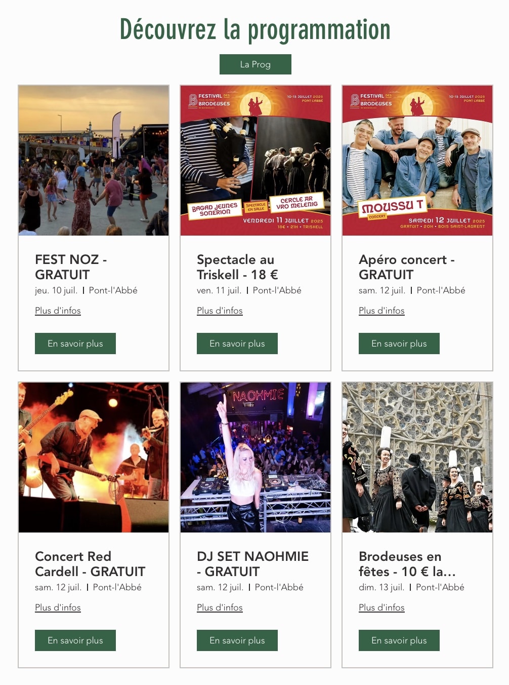 - Lieux : centre-ville, Bois Saint-Laurent, Triskell, théâtre de verdure