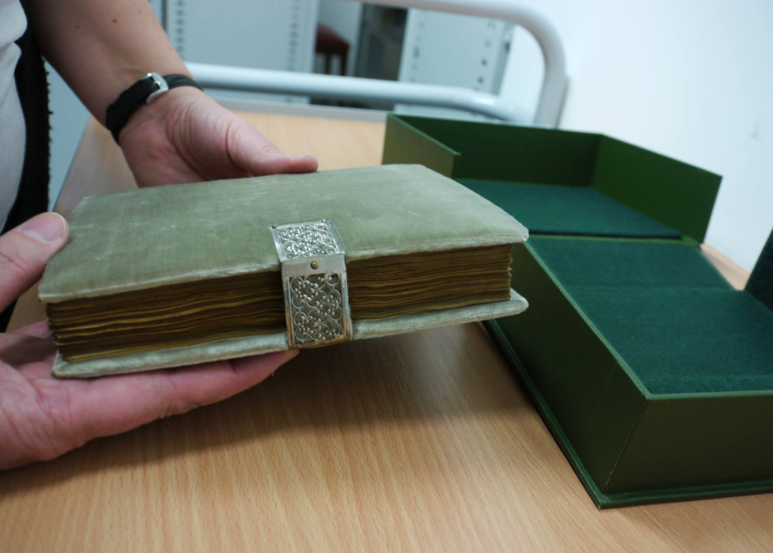 Sur les étagères, petits et grands trésors, contemporains et anciens, sont soigneusement rangés dans de jolies boîtes de conservation. 120 incunables (les imprimés du Moyen-âge),« près de 3000 manuscrits, parmi lesquels 75 datant du Moyen-âge, dont le plus ancien date du XIe siècle » et une très belle collection de livres d’artiste y sont conservés. « L’incunable le plus ancien que nous possédons est un livre de Cicéron, imprimé en Italie en 1465, à côté de Rome. » Imprimés en une seule couleur, les premiers imprimés imitent les manuscrits, « les lettrines sont rajoutées à la fin, à la main, par un rubricateur, en charge des titres et des initiales. Cette pratique va peu à peu disparaître et on imprimera l’intégralité du livre. » Aux côtés des pages imprimées, une annotation du bibliothécaire date de la Révolution et d’autres, plus anciennes, dans les marges, sont l’œuvre d’un lecteur du XVe ou XVIe siècle. « Il provient des Dominicains de Rennes qui résidaient dans l’ancien couvent des Jacobins et fait partie des confiscations révolutionnaires. »