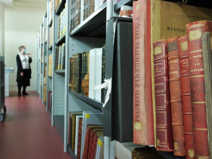Que sont les fonds patrimoniaux ? De quoi les collections sont-elles constituées ? De livres certes, mais de quoi d’autre ? Pour une rencontre avec un passé, aussi lointain que proche, Sarah Toulouse nous a ouvert les portes des fonds patrimoniaux de la Bibliothèque des Champs libres, installés dans les sous-sols du bâtiment construit par Christian de Portzamparc. « 200 000 documents sont disponibles au prêt et 400 000 sont conservés dans les fonds patrimoniaux », souligne-t-elle dans l’ascenseur après un arrêt au sixième étage, espace dédié à la consultation des fonds de conservation et du dépôt légal. « Une partie des fonds est conservée aux Champs Libres, l’autre dans le bâtiment des archives municipales. » Toute personne peut effectuer une demande de consultation pour des recherches scientifiques, universitaires ou tout simplement personnelles.