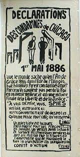 C’est ainsi que le 1er mai 1886, à Chicago, commence une grève; les jours suivants des ouvriers grévistes sont chargés par la police devant les usines Mac Cormick. Il y a aura des blessés et des morts, ceux qui sont considérés comme les leaders seront pendus le vendredi 11 novembre 1887 (connu depuis comme Black Friday ou « vendredi noir »), les autres condamnés à perpétuité (ils seront graciés quelques années plus tard) et Louis Lingg se suicidera… C’est en hommage à ces « martyrs de Chicago » que la date du 1er mai est choisie en 1889 par l’Internationale ouvrière, comme étant une journée d’action des ouvriers dans le monde entier.