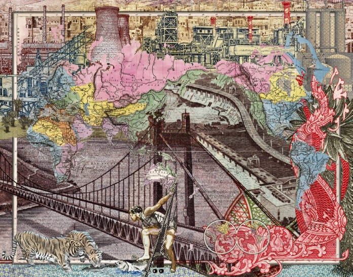 d’objets trouvés ou récupérés dans l’univers du bricolage. Ses assemblages sont ensuite ornés de couleurs vives et de motifs abstraits.