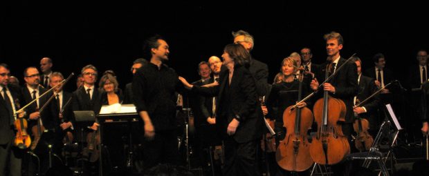 L’OSB est totalement à l’aise face aux arrangements du pianiste « Nobu », le Japonais Nobuyuki Nakajima, répond sans coup férir aux gestes efficaces de son chef invité, Didier Benedetti, déjà croisé quelques fois sur la scène rennaise. Il offre même quelques instants de pure beauté, notamment avec l’introduction pleine d’émotion proposée par Olivier Lacour et son violoncelle ; il distille dans un silence religieux des notes graves et mélodieuses. Il est relayé quelques instants plus tard par un Anatol Karaev en état de grâce, étonnant de précision au violon, qui entame un dialogue avec Jane Birkin, avant de recevoir, presque avec gêne, les ovations d’un public émerveillé. Jane chante à cet instant qu’elle a reçu le meilleur de Serge ; il s’avère impossible de ne pas la croire ! Irving Legros et son cor anglais ne seront pas en reste, ponctuant la chanson de Prévert des sonorités sensuelles que permet son instrument.