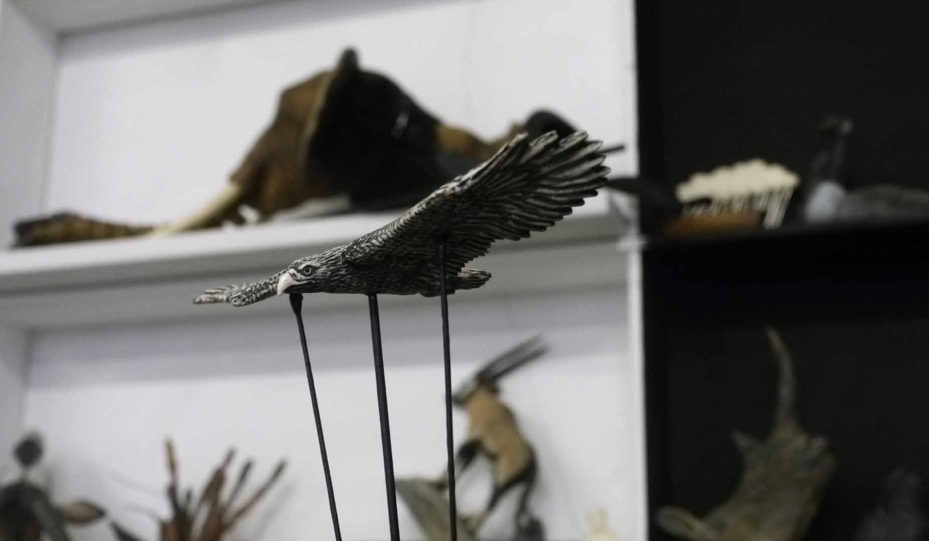 Bois, fer, pierre, os, etc. Georges Peignard donne vie à des objets au moyen de matières premières, écho aux temps anciens où l’homme vivait en adéquation avec le monde et la nature, avant l’ère industrielle. « En travaillant la matière, j’imagine l’essence émanant de ce matériau à fort caractère – explique t-il. Le bois est avant tout un arbre qui n’a aucunement envie d’être tronçonné et débité. Toute matière primitive a forcément une identité autre que celle conférée par l’homme. Cette altérité est importante dans l’idée du dialogue ».