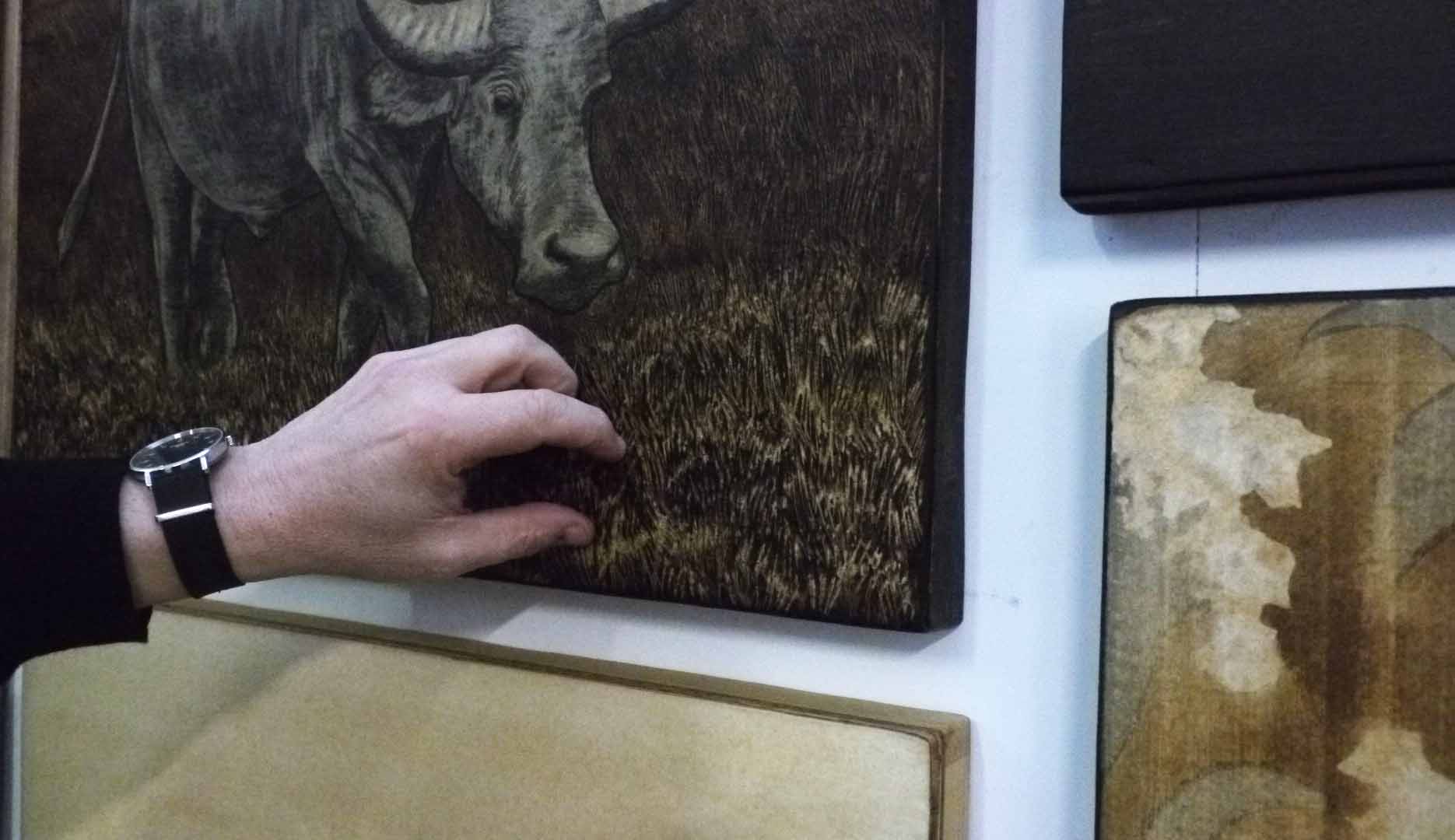 Il en va de même avec ses dessins dont la patte est résolument celle d’un sculpteur. Georges Peignard traite l’image comme une sculpture, gratte plus qu’il ne peint. « J’utilise de l’encre senellier chargé en gomme-laque, une pâte noire grasse. Je modèle la texture plus que je dessine, toujours dans l’idée de la soustraction », précise-t-il en mimant le geste de ses mains.