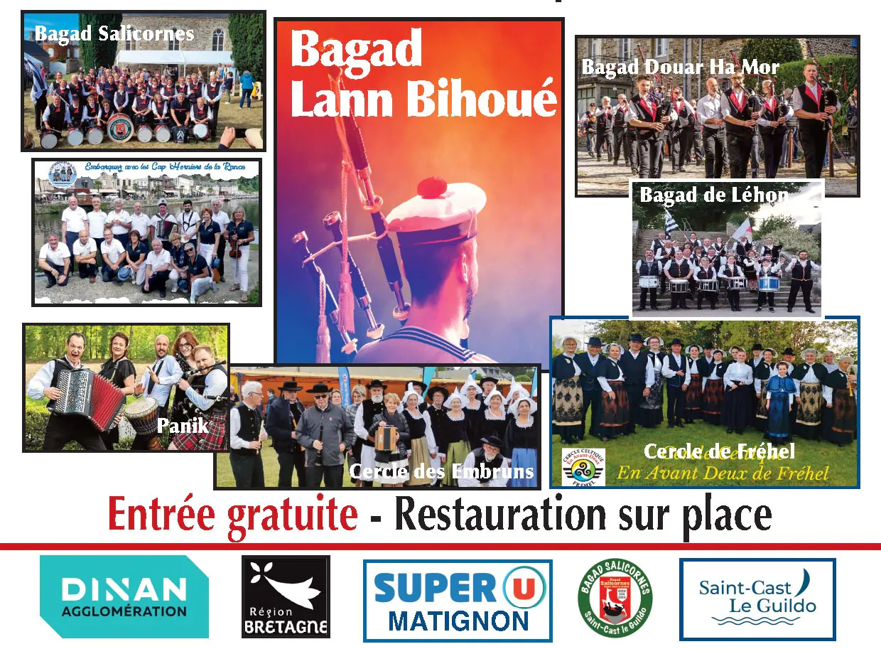 A Saint-Cast-le-Guildo dans les Côtes-d’Armor, sur la Côte d’Émeraude, des invités exceptionnels seront à l’affiche du programme des samedi 17 et dimanche 18 mai : le Bagad de Lann Bihoué ; le Bagad de Léhon ; le Bagad Salicornes ; le Bagad de La Richardais ; Panik ; le Cercle de Fréhel et le Cercle des Embruns ; et les Cap Horniers de la Rance – Grand Fest Noz le samedi soir de 18h30 à minuit – Défilé et concert le dimanche de 11h00 à 19h00