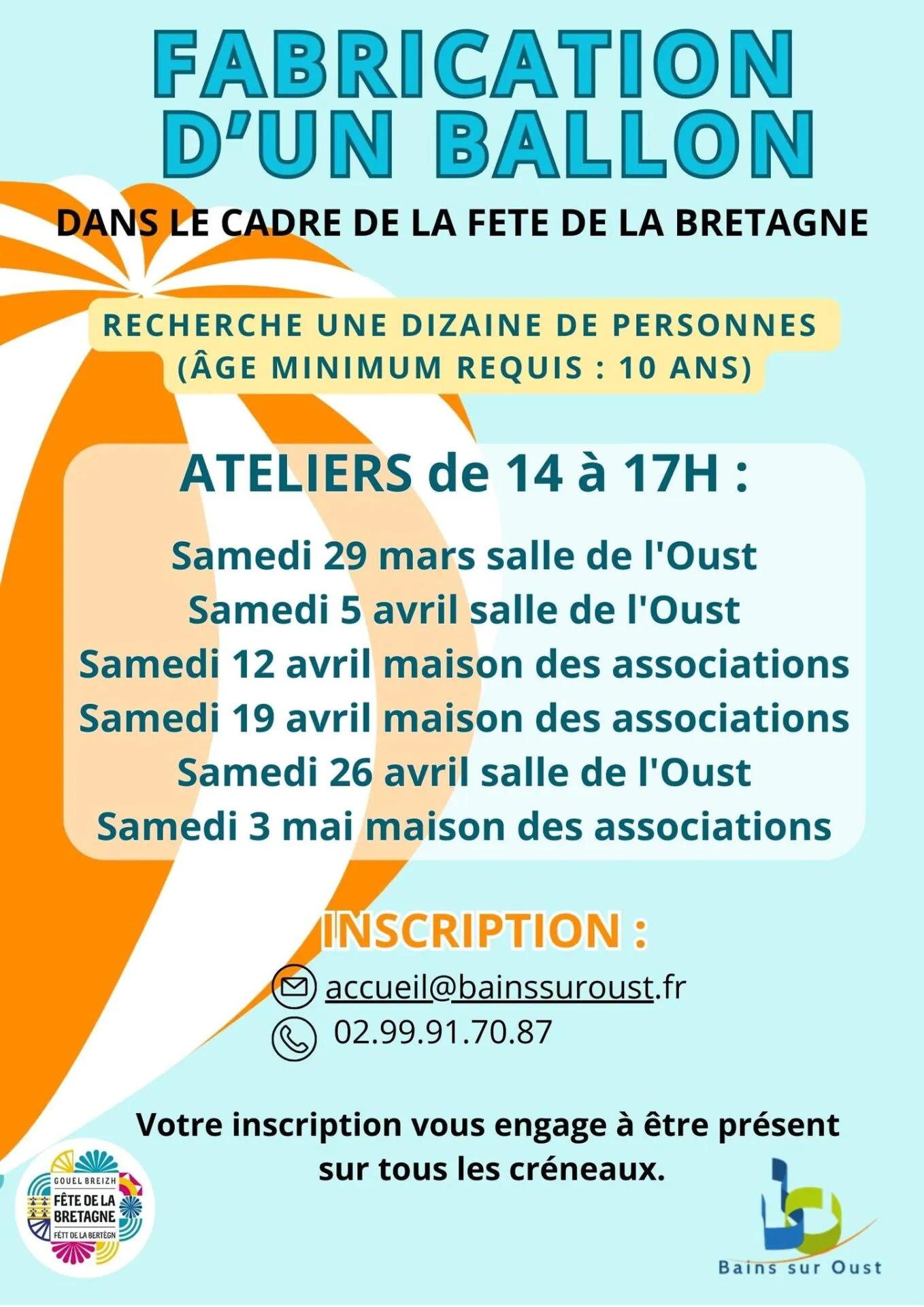 Bains-sur Oust en Ille-et-Vilaine propose une confection collective : la construction d’un ballon géant d’inspiration bretonne en papier de soie, le week-end des 17 et 18 mai. Elle est organisée par Les Semeurs d’Étoiles, une association artistique autour de la création de ballons en papier basée sur les échanges internationaux avec la France, le Brésil, la Colombie, le Salvador, le Mexique et l’Italie. Ils inviteront le public à des ateliers, le samedi 17 mai de 14 à 17h