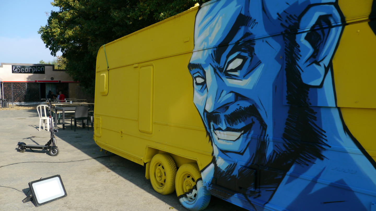Le terrain de l’îlot U, dans le quartier de Beaulieu, loge de nouveaux habitants atypiques depuis fin juillet 2022. Dans cette zone particulièrement vide de toute structure culturelle, à l’endroit qui abritait encore récemment des gens du voyage, un génie jongleur, graffé par le Rennais Mya de l’association Asarue, ouvre la voie vers La Grande Nomade, nouveau spot hybride et populaire rennais. Debout ou assis sous son parasol à franches bleues, Philippe, bénévole retraité qui répond présent tous les jours, accueille avec bienveillance et sourire chaque personne qui franchit la clôture.