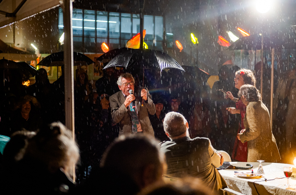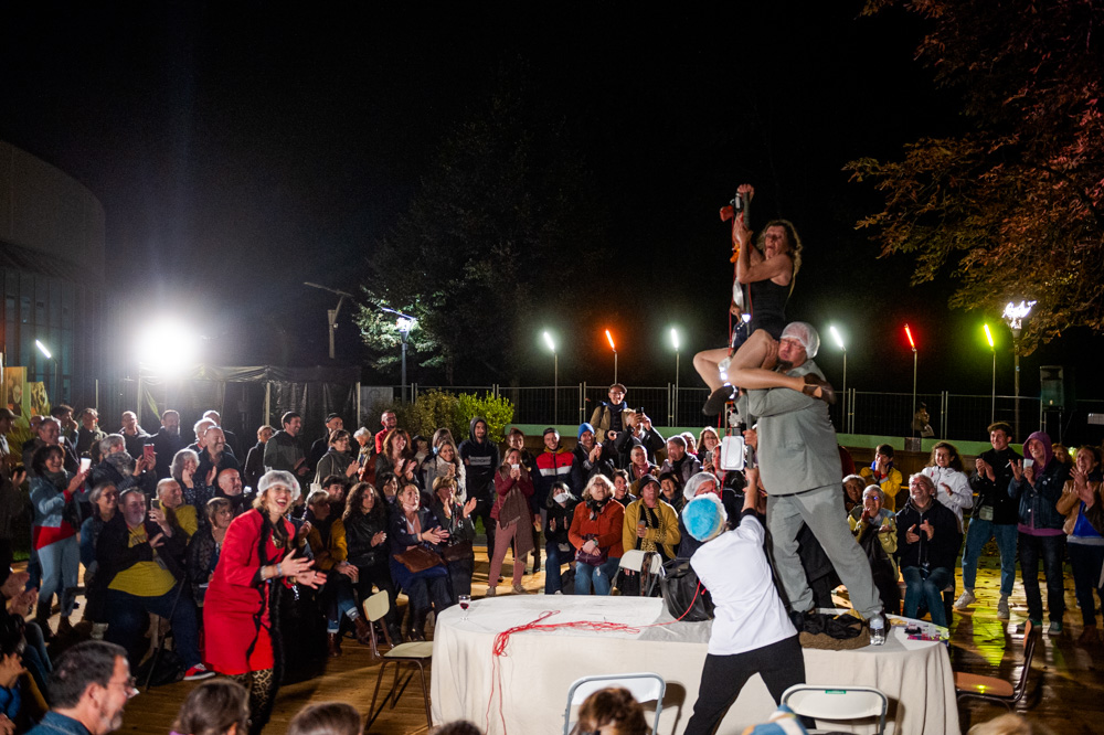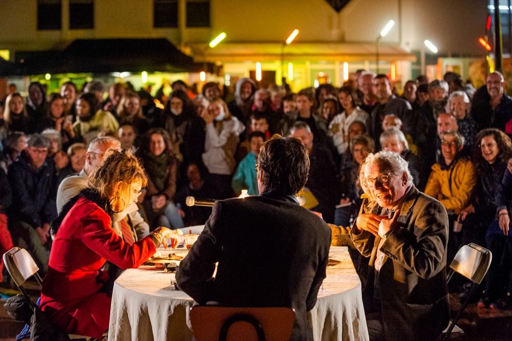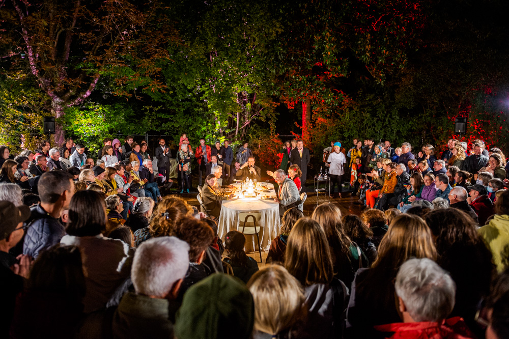 C’est bien ce jeu avec les repères du réel qui est à l’œuvre dans La Grande Tablée. Mais, délaissant les objets, la compagnie Opus s’aventure là dans un spectacle de paroles. « Comme ça arrive parfois, c’est un spectacle qui s’est créé rapidement, sur le tas », raconte Ronan Letourneur. C’est à l’occasion du festival de danse Panique au dancing à Niort, où est basée la compagnie, en 2019, que naît le concept du spectacle. En 2021, La Grande tablée fait son retour au même festival dans une version plus travaillée. Elle est alors repérée par Claude Guinard qui invite la compagnie Opus à tenter l’expérience aux Tombées de la nuit. Ce sera donc la première fois qu’elle est représentée en dehors du festival qui l’a vue naître.