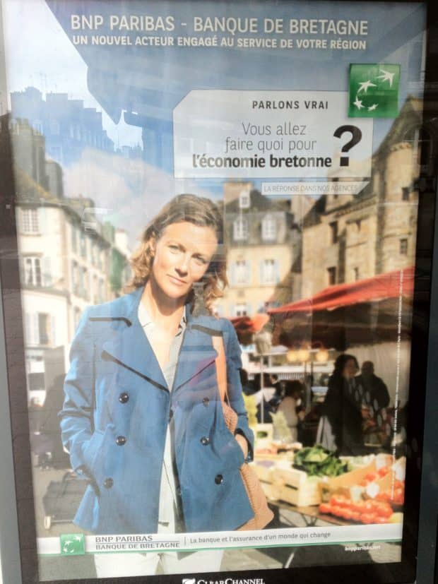 En effet, on y voit une jeune dame un peu stricte (mi-magistrate mi-banquière) alpaguer le passant par une question intrusive, voire un tantinet inquisitrice : « Parlons vrai : Vous allez faire quoi pour l’économie bretonne ? ». Une fois passée l’envie de lui répondre “en quoi ça vous regarde, madame l’inconnue ?!”, on s’étonne de cette soudaine prise en compte de la dimension locale de la part de la BNP qui, comme son homologue le Crédit Agricole, sont connus pour leurs frais bancaires astronomiques et pour être passés maîtres dans l’évasion fiscale en direction des paradis fiscaux. Etrange façon de concevoir la défense de l’intérêt national et local !