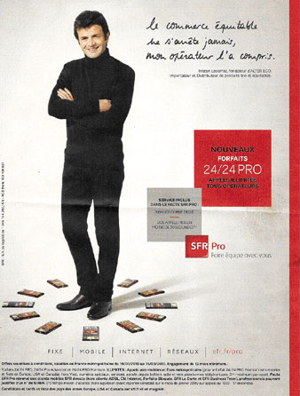 Impossible donc de relier le monde sans états d’âme de la rentabilité avec celui du commerce équitable. Le commerce équitable fonctionne quasiment à l’inverse, précisément avec des états d’âme. Son objectif : un codéveloppement de la production et des besoins par une rentabilité raisonnable avec des marges justes et justifiées. Du moins est-ce ce que beaucoup d’entre nous pensent. Pourtant, la campagne de publicité SFR [février 2010] dont le Courrier international se fait l’écho réussit le grand écart. Le lecteur y voit une page entière dédiée à la rencontre de cet opérateur et de Tristan Lecomte, le PDG d’Alter Eco.