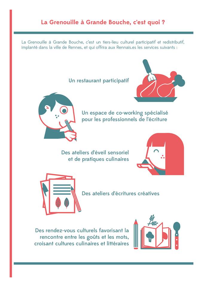 Tous deux se sont lancés avec le soutien de Tag35, un propulseur local de « l’entrepreneuriat collectif ». Les personnes intéressées par l’économie sociale et solidaire y reçoivent conseils et formations pour préparer leur projet d’association ou d’entreprise. L’équipe de la Grenouille à Grande Bouche a ainsi pu se former au marketing, au financement d’entreprise, à la gouvernance, à la gestion des ressources humaines… et tisser des liens. Séparés de quelques dizaines de mètres, le restaurant temporaire de la Grenouille à Grande Bouche et la conciergerie du p’tit Blosneur sont aussi reliés par des liens d’amitié.