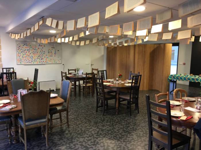En salle, trois bénévoles font le service. Quand on les voit s’empresser à une table, échanger entre eux, on sent pointer l’anxiété sous leur bonne volonté. Ils se précipitent vers l’entrée au moindre bruit de porte, viennent par deux à une table pour être sûrs de bien prendre la commande. À l’intérieur de la salle, sous les guirlandes de vieilles pages, il n’y a plus qu’une table vide. En sueur, Nathanaël Simon fait le pont entre ces bénévoles qu’il encadre et la cuisine.