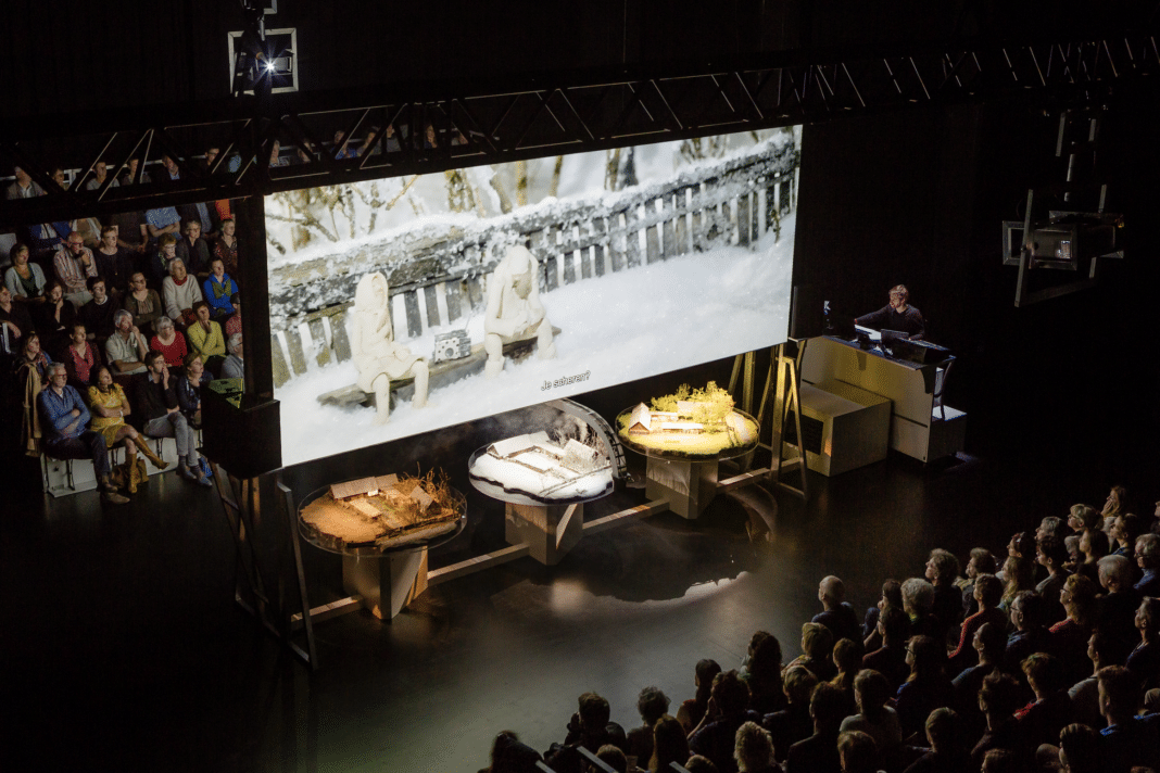 Assis sur des gradins, le spectateur devient, l’espace d’un instant, l’élève dans un amphithéâtre, assistant à un cours magistral sur un conte de son époque, l’Holocène. Sous l’écran bilatéral de 6 mètres de large, trois maquettes : autant de représentations de la ferme de Nadia et Pétro en hiver, en été et en automne. « Les maquettes sont disposées dans des réceptacles en verre telle une coupelle d’observation au microscope », explique Bart sur le choix scénographique. Deux caméras miniatures tournent autour des trois modèles réduits, incorporant par des manipulations numériques le film a la maquette ou la maquette au film.