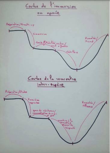 Le premier choc est celui que créé en elle la découverte de l’apnée dans l’île grecque d’Amorgos, où fut filmé Le Grand Bleu (Luc Besson, 1988). La jeune danseuse est éblouie, d’une part, par la reconnexion à la mer que l’apnée engendre en elle et, d’autre part, par la découverte de sensations corporelles qu’elle recherche en danse : la densité du corps dans l’espace, la sensation d’abandon à l’intérieur du liquide, sensations démultipliées et exacerbées sous l’eau.