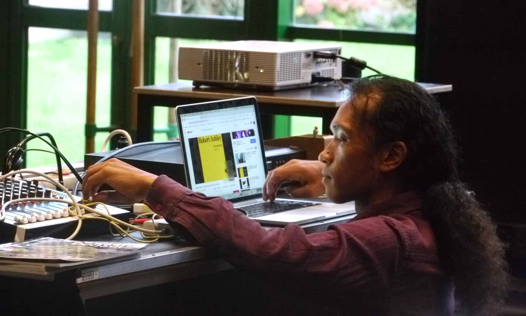 La projection d’un bonsaï, art traditionnel japonais, s’affiche sur un écran et accueille les participants dans le grand studio du CCNRB. Bruce Chiefare ouvre le bal de cette nouveauté proposée par le collectif FAIR-E, les Heures Joyeuses.