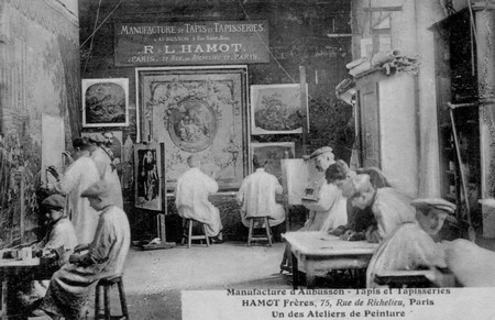 La Révolution ne fit pas disparaître les grandes manufactures qui avaient été glorieuses sous les rois, mais le XIXe siècle passa tout entier sans que la tapisserie française pût sortir de l’ornière où elle était tombée. C’est le temps où l’on fabrique natures mortes et paysages, assez finement tissés pour donner l’illusion de tableaux lorsqu’on les encadre et qu’on les pend au mur. Étrange destinée que celle d’un art vicié jusque dans son principe par sa perfection même !
