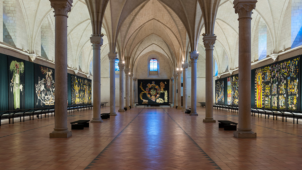 Sans remonter aux traces historiques, voire préhistoriques de l’usage de la tapisserie, rappelons que c’est le Moyen-Âge qui en représente l’Âge d’or. D’abord parce qu’elle associait fonction thermique, ludique et prestigieuse sur les murs des châteaux, des demeures et des monuments religieux, églises, cathédrales et monastères. Elle est ainsi devenue signe d’opulence, de richesse, de pouvoir et de longévité artistique au point d’acquérir un statut égal sinon supérieur à la peinture – fresques ou tableaux -.