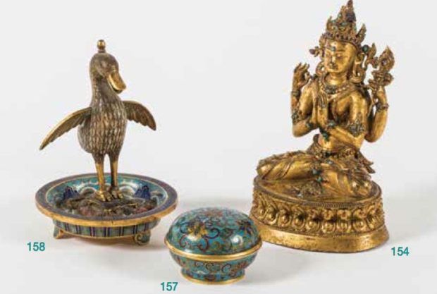 Il a crapahuté partout mais a rapporté peu d’objets – trop encombrants, trop fragiles. Vous le comblerez avec une extraordinaire statuette tibétaine de Sadaskari en bronze doré avec incrustations de turquoise et de malachite (3000/5000€), une boite chinoise de forme lenticulaire en émaux cloisonnés (4000/5000€) ou plus modestement, un personnage japonais en ivoire gravé (180/250€).