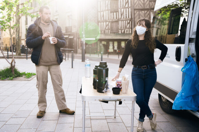 Même s’ils ont ralenti le rythme depuis, les bénévoles continuent, trois fois par semaine de 19 h à 1 h du matin à peu près, de parcourir la ville. Le travail commence plus tôt dans la journée, dans leur local du quartier Saint-Grégoire. On prépare des plats cuisinés à distribuer le soir, et on charge la camionnette. L’équipe suit ensuite un parcours qui la fait s’arrêter à différents points de rendez-vous où elle installe son stand de boissons chaudes, retrouve ses habitué.e.s, et parfois des têtes nouvelles. Selon les dires de Sami, l’objectif est aussi bien d’apporter une aide matérielle (« des plats préparés, de l’alimentaire sec, des kits d’hygiène, des vêtements, du matériel de mise à l’abri, on tient même une liste où les gens peuvent exprimer ce qu’ils aimeraient avoir la prochaine fois », précise Sami), que de leur offrir une présence, une oreille attentive, un moment d’échange.